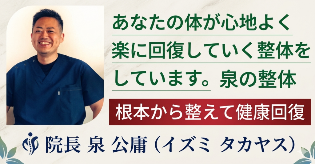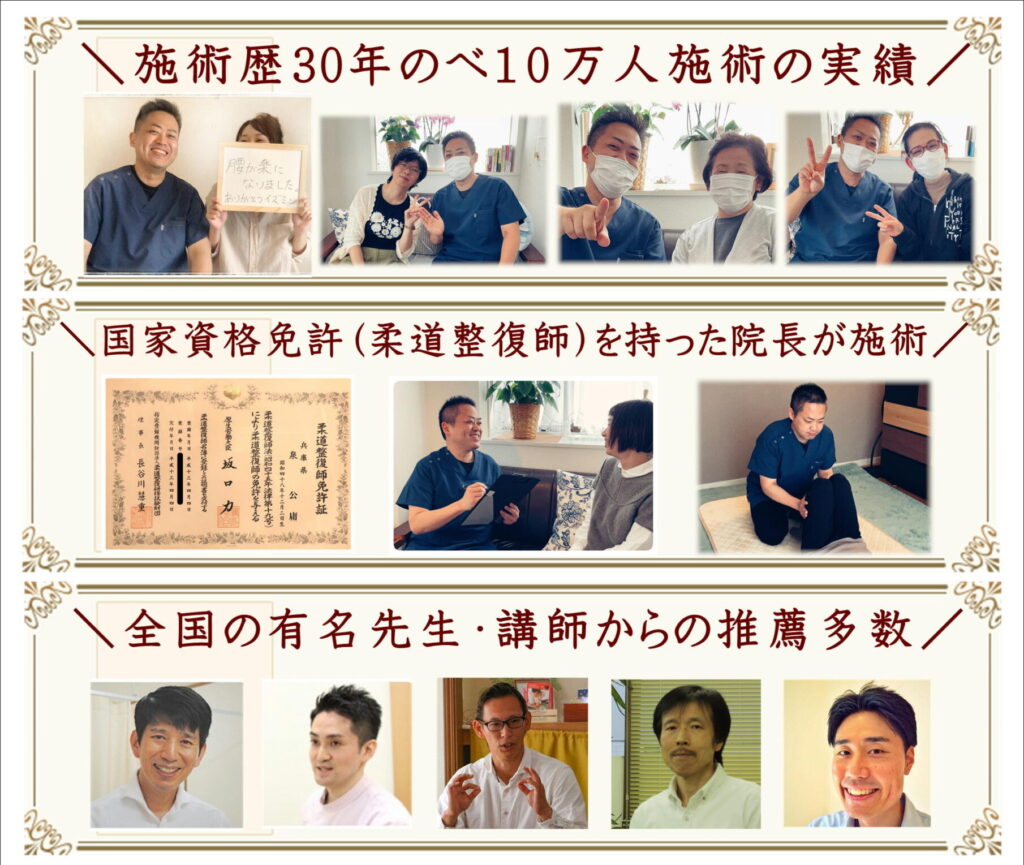 当院、泉の整体は医療系の国家資格所持(柔道整復師)の院長(泉 公庸)だけが施術整体するので、安心して受けていただけます。(他の整体院さんでは無資格の施術者や数ヶ月勉強したでけで施術される様な所もあります。)信頼と安心が違います。