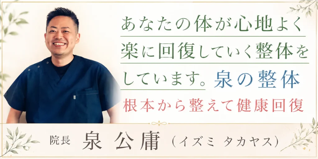 「体(からだ)は治りたがっている。」私の整体の師から言われた言葉です。本来、人の身体は何処か悪くなった・不調になった際に治す(戻す)力があります。それが良くならないのは休息や栄養などが足りていないのかもしれません。そして、本来良くなる力(自己治癒能力)がちゃんと働かない身体になっているのかもしれません。それが『からだの歪み』だったり『ストレス』が原因であったりします。そのようなお体(状態)を良くするお手伝いが当院の『自然派整体』です。あなたがあなたの体や人生をより良く心地よく過ごしていく為のサポートが当院に出来るならば幸いに思います。一人で悩まずに…ぜひ一度当院の「自然派整体」でからだも心も癒されに来て下さいね。お待ちしております。神戸駅前「泉の整体」・自然派整体は体も心もやさしく整えてソウカイな人生のお手伝いをする~ そんなあなただけのプライベート整体院です~